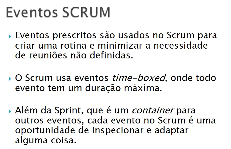 Uma reunião curta realizada todos os dias para que a equipe de desenvolvimento compartilhe o que foi feito desde a última reunião, o que será feito até a próxima reunião e quaisquer obstáculos que estejam impedindo o progresso. É uma oportunidade para sincronização e resolução rápida de problemas.